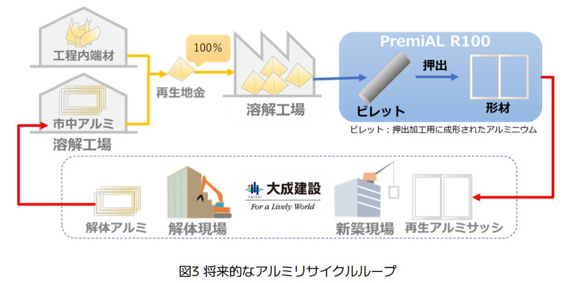 今後LIXILは大成建設と連携し、同社施工の解体、リニューアル工事現場等から回収したアルミサッシなどを原材料や材料の一部として再生利用し、「PremiAL R70」を上回るリサイクルアルミを100%使用した「PremiAL R100」を同社施工の新築現場などに積極的に採用いただくことで、アルミリサイクルループの構築を目指していきます。(図3参照)