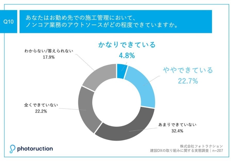 「Q10.あなたはお勤め先での施工管理において、ノンコア業務のアウトソースがどの程度できていますか。」(n=207)と質問したところ、「かなりできている」が4.8%、「ややできている」が22.7%という回答となりました。