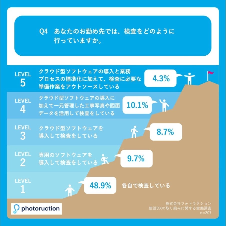 「Q4.あなたのお勤め先では、検査をどのように行っていますか。」(n=207)と質問したところ、「レベル1:各自で検査している」が48.9%、「レベル4:クラウド型ソフトウェアの導入に加えて一元管理した工事写真や図面データを活用して検査をしている」が10.1%という回答となりました。