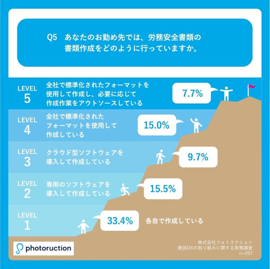 「Q5.あなたのお勤め先では、労務安全書類の書類作成をどのように行っていますか。」(n=207)と質問したところ、「レベル1:各自が作成している」が33.4%、「レベル2:専用のソフトウェアを導入して作成している」が15.5%という回答となりました。