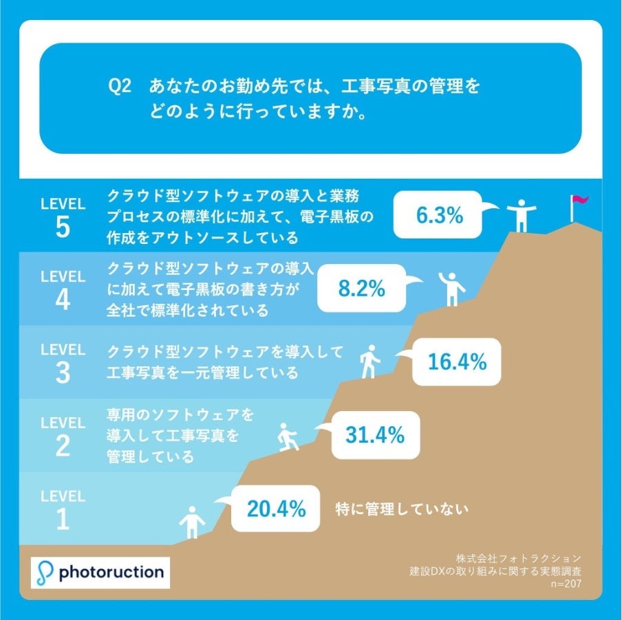 「Q2.あなたのお勤め先では、工事写真の管理をどのように行っていますか。」(n=207)と質問したところ、「レベル2:専用のソフトウェアを導入して工事写真を管理している」が31.4%、「レベル1:特に管理していない」が20.4%という回答となりました。