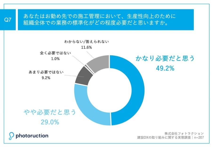 「Q7.あなたはお勤め先での施工管理において、生産性向上のために組織全体での業務の標準化がどの程度必要だと思いますか。」(n=207)と質問したところ、「かなり必要だと思う」が49.2%、「やや必要だと思う」が29.0%という回答となりました。