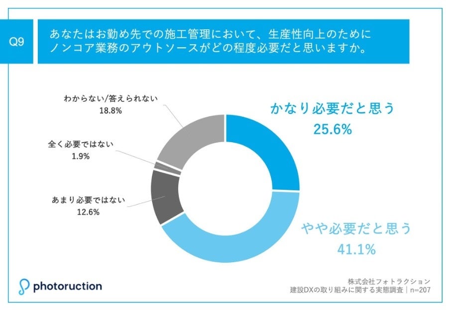 「Q9.あなたはお勤め先での施工管理において、生産性向上のためにノンコア業務のアウトソースがどの程度必要だと思いますか。」(n=207)と質問したところ、「かなり必要だと思う」が25.6%、「やや必要だと思う」が41.1%という回答となりました。