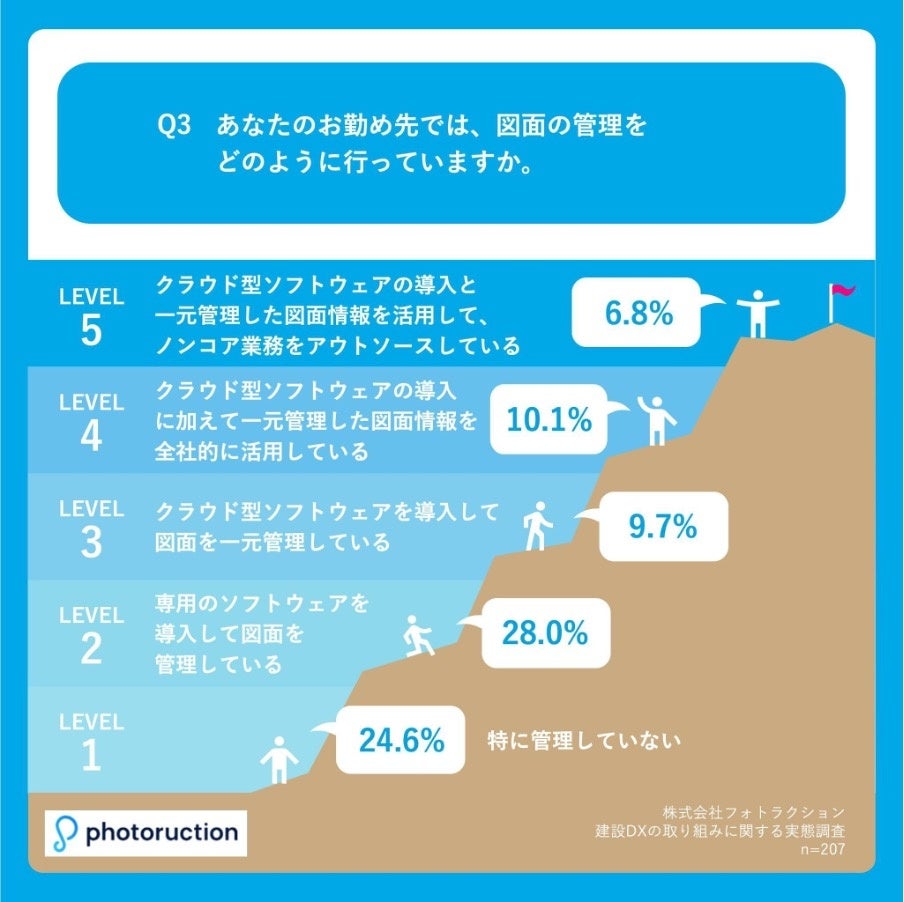 - 工事写真の管理では、「専用ソフトウェアで管理(レベル2)」が31.4%で最多