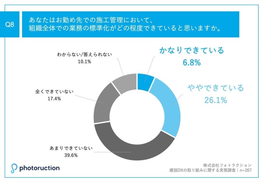 「Q8.あなたはお勤め先での施工管理において、組織全体での業務の標準化がどの程度できていると思いますか。」(n=207)と質問したところ、「かなりできている」が6.8%、「ややできている」が26.1%という回答となりました。