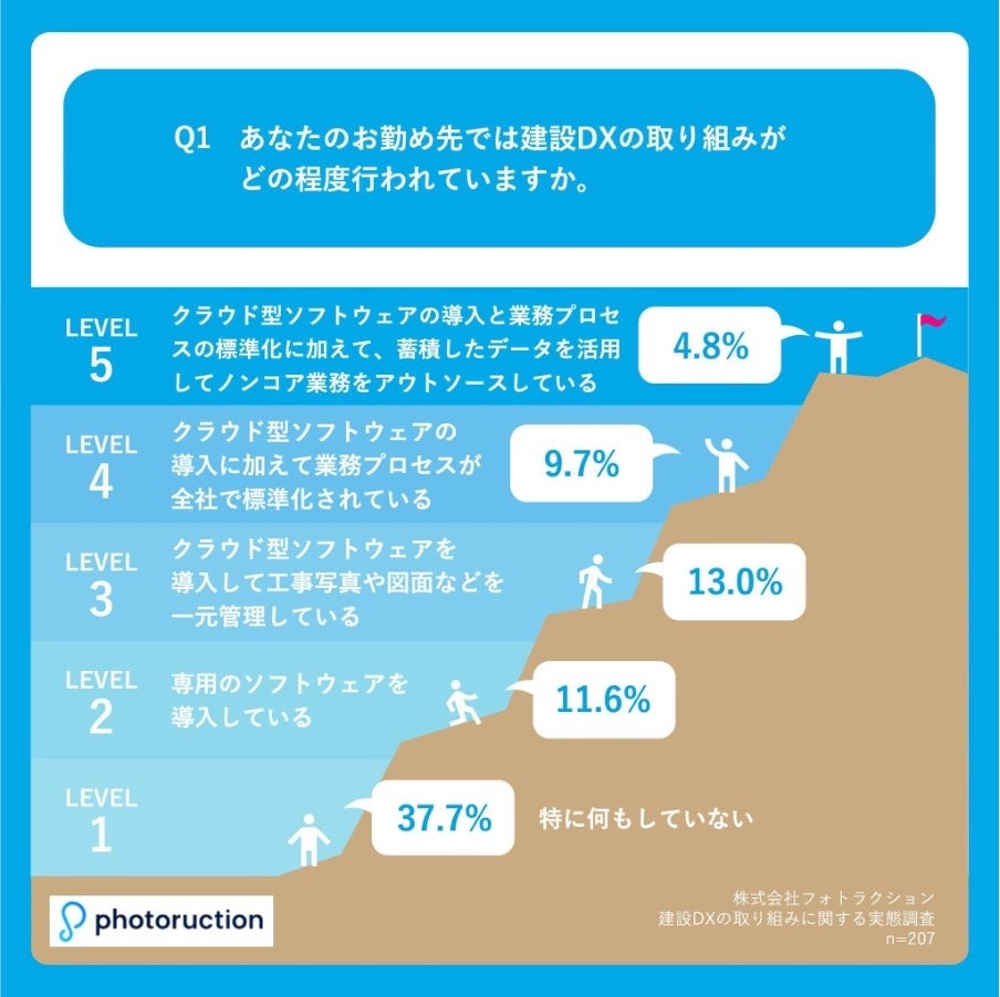 建設業向けのBPaaS(SaaS + AI-BPO)「Photoruction(フォトラクション)」の開発および運営を行う株式会社フォトラクション(本社:東京都中央区、代表取締役 CEO:中島 貴春)は、建設業に勤める施工管理担当者207名を対象に、建設DXの取り組みに関する実態調査を実施しましたので、お知らせいたします。