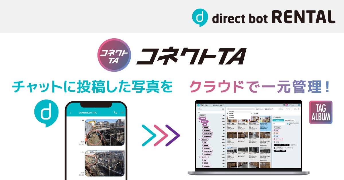 そこで、普段お使いの「direct」に投稿している写真が、別途写真アプリを起動することなく、タグ付けされ、現場向けクラウド写真共有サービス「タグアルバム」に自動転送されるチャットボット「コネクトTA」を開発いたしました。