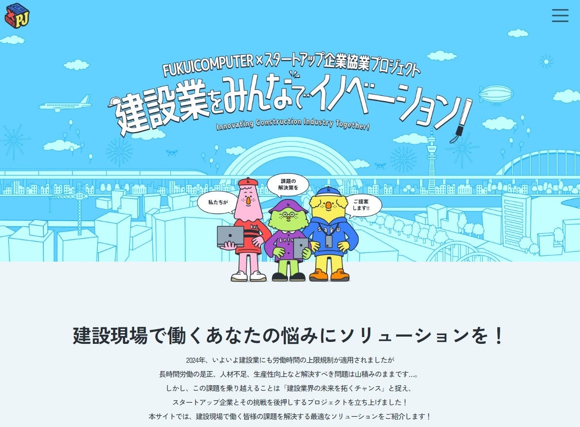 本取組に先立ち、2024 年 4 月に「FUKUICOMPUTER✕スタートアップ企業協業プロジェクト」として特設サイトを公開しております。このサイトでは、建設現場で働く課題に対し、様々なソリューションの紹介を行っております。