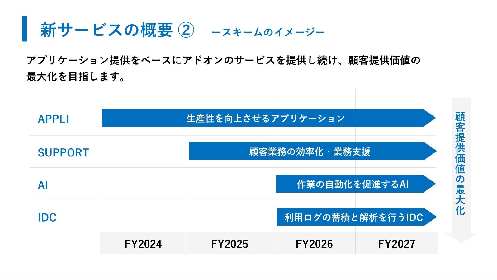 マーケットプレイスを用いたアプリケーションの提供をベースに、福井コンピュータスマートの優れたサポートチームによる支援やデータセンターにおけるログ解析により、顧客の業務の自動化、最適化を促します。この新たなスキームによって、顧客やパートナー企業により多くの価値の提供を目指すと共に、多様な建設業の課題に対応し、持続的なビジネス成長を実現いたします。