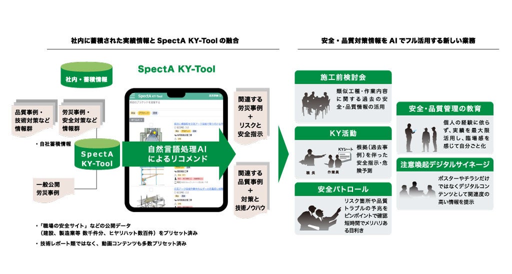 公開情報に加え、同社に蓄積された膨大な過去の安全・品質管理に関わるデータや関連情報を学習させた「SpectA KY-Tool」により、作業予定内容に対して関連度が高い危険要因と対策の選定を、熟練エンジニアの暗黙知や経験に依らず、過去の労働災害データや品質対策データに基づいて実施できるようになりました。