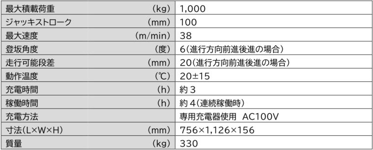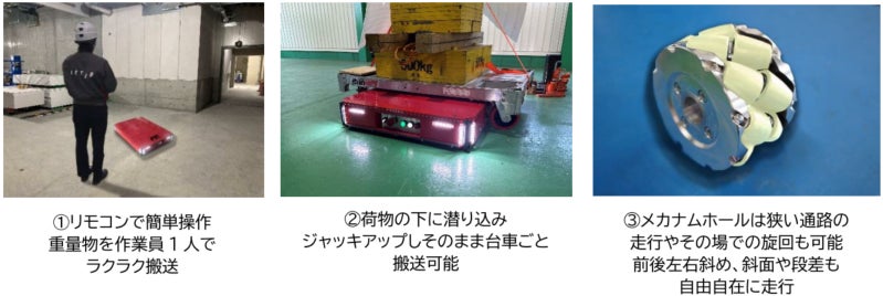 また、メカナムホイールを搭載しており、全方位への走行が可能で、狭い通路やその場での旋回、斜面や段差も走行できます。さらに、ジャッキアップ機能を搭載したことで、荷物の真下に入り込んでの運搬が可能になりました。これにより、荷物の積み替えをする必要がなく作業員の負担軽減に貢献します。