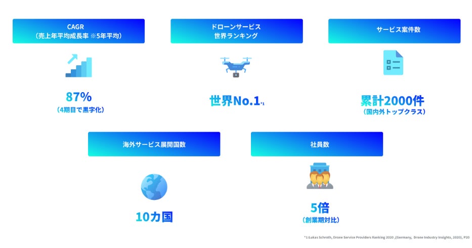 2016年に創業。東京本社含め、全国に拠点を構え、海外においても欧州・東南アジアを中心に事業展開する、世界最大の産業用ドローンソリューションプロバイダー。世界的なドローン市場調査機関のDrone Industry Insightsによる「ドローンサービス企業 世界ランキング2020」において、世界1位に選ばれ、2022年3月にシリーズBの資金調達を行い、累計95.1億円の資金調達を実施しました。