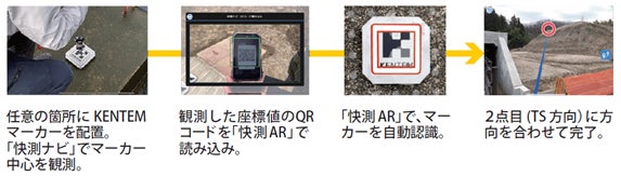 2点座標による位置合わせはもちろんのこと、杭の無い任意の場所で位置合わせが可能です。任意の箇所に「KENTEMマーカー」を配置し、「快測ナビ」でマーカー中心を観測。観測した座標値のQRコードを「快測AR」で読み込むことで、マーカーを自動認識。