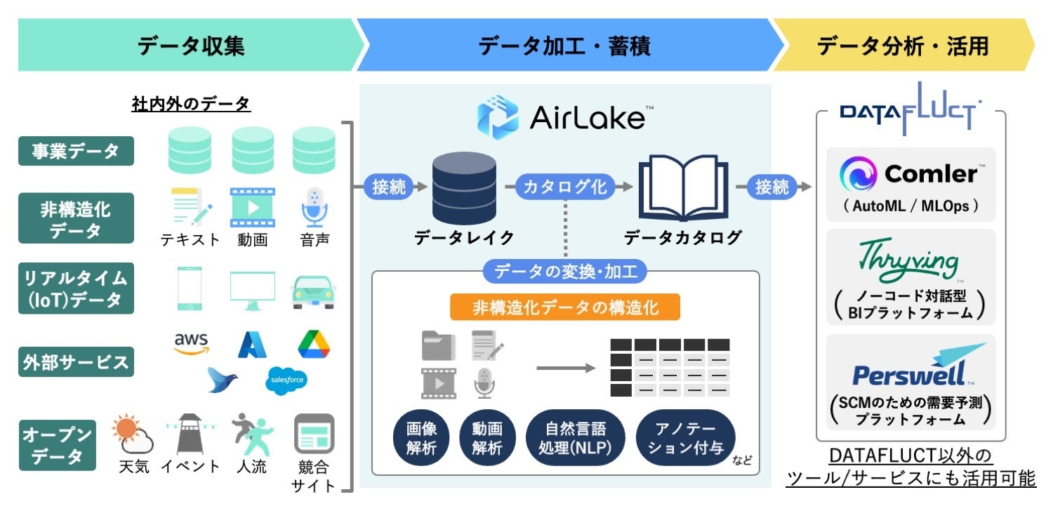 『AirLake(エアーレイク)』は、データ活用の前工程である収集、加工、蓄積における課題を解決し、これまでにないデータ同士の組み合わせから新たな洞察を得られる環境を提供するデータレイク/データウェアハウスです。データサイエンティストやエンジニアがいなくても、画像や動画、音声、文書などの非構造化データを簡単に加工・変換できます。また、社内・社外、構造化・非構造化を問わずどこからでも必要なデータを収集し、カタログ化したデータを一元管理できます。