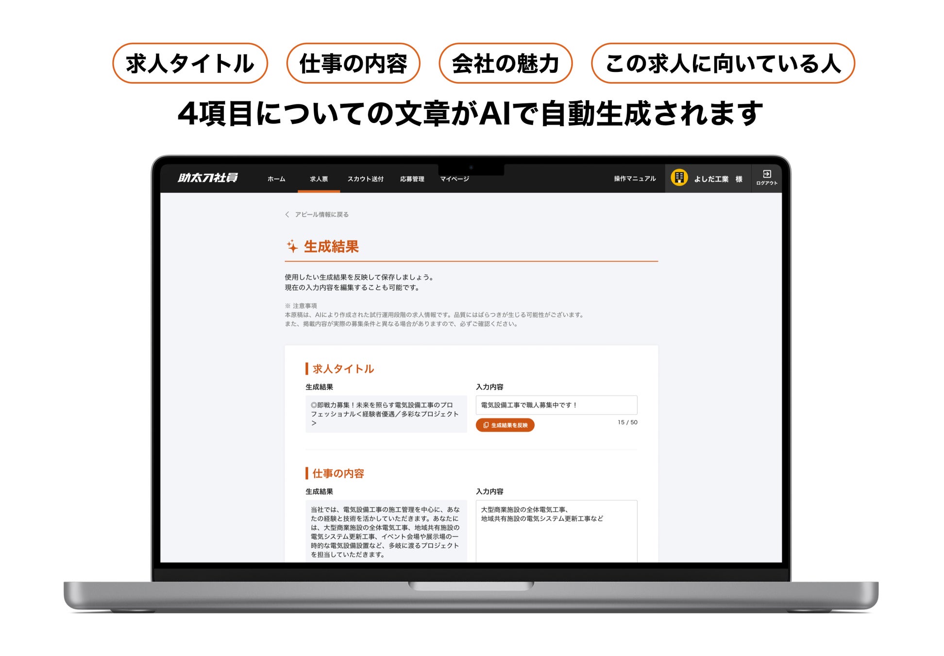 この度、当社では生成AIを導入した求人原稿作成補助システムをリリースしました。このシステムは、建設業に特化した求人サービス「助太刀社員」で培ったノウハウと生成AIによる文章生成能力を合わせることで、求人原稿作成にかかる時間と労力を大幅に削減し、抑えるべきポイントが網羅された魅力的な求人原稿を自動で作成することが可能になります。