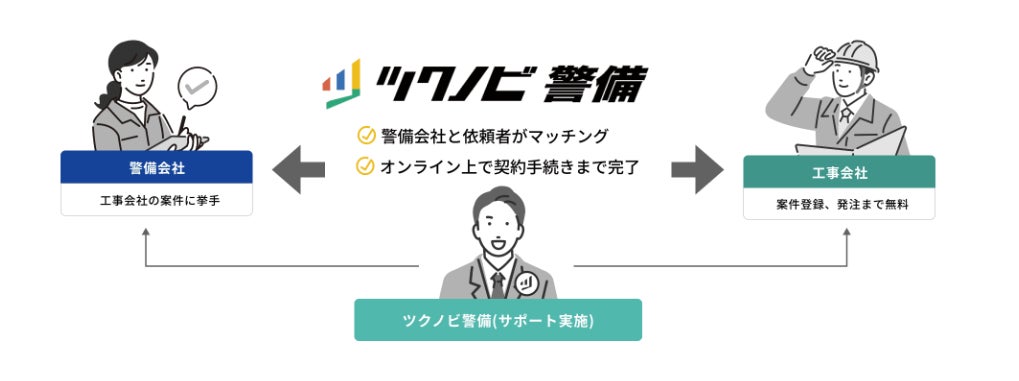 ツクノビ警備とは個人や企業など警備を依頼したいお客様が、警備会社にお仕事を依頼できるシステムです。