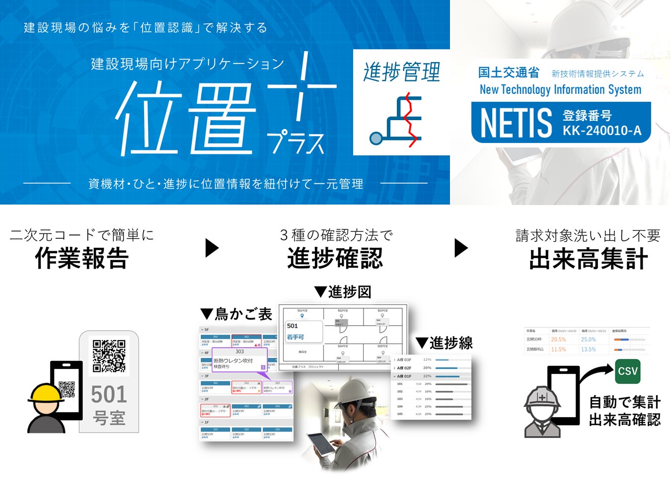 株式会社朝日興産(社長:宮本靖雄)は、位置プラス®シリーズのクラウドサービス「進捗管理」が、国土交通省の新技術情報提供システム「NETIS(New Technology Information System)」に登録されたことをお知らせいたします。