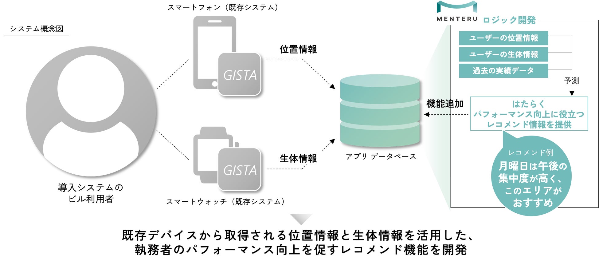 上述の社会課題に対し、竹中工務店では執務者の計測データに基づいてオフィス空間を評価するシステム「GISTA(ジスタ)」アプリを展開しています。メンテルでは、「GISTA」に搭載する機能として執務者の集中力を向上するレコメンド機能を竹中工務店と共同で開発しています。竹中工務店が保有する執務空間の設計施工に関する知見と、メンテルが保有するデータとAIの活用に関する知見を相互に連携することで、執務者の集中力向上とオフィス空間の改良に貢献していきます。