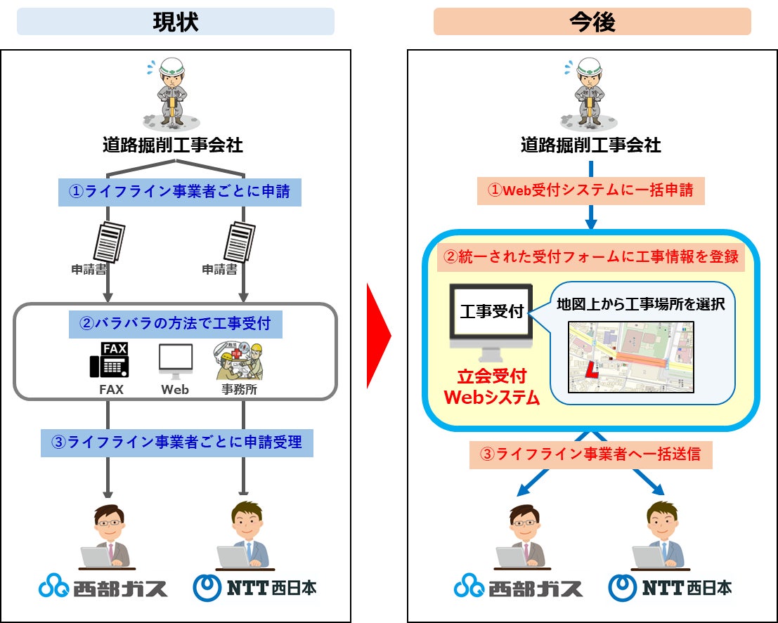 西部ガスおよびNTT西日本は、本Webシステムを利用した共同受付を開始し、年間約2万件(※)にもおよぶ受付業務の効率化を図ります。また、道路掘削工事会社が複数のライフライン事業者へワンストップで申請可能となる仕組みを、西日本エリアで初めて実現し、建設業界の働き方改革やDX推進などの社会課題の解決に取り組みます。