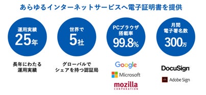 11万社の法人のサーバー運用実績、国内販売代理店 約6,700社の販売代理店を有するホスティング事業者であり、世界で5社しかないグローバルでシェアを持つ電子認証局の中で唯一の国産認証局「GlobalSign」を保有する老舗IT企業です。政府関連機関・大手企業をはじめ世界各国の企業・団体に電子証明書を導入しています。