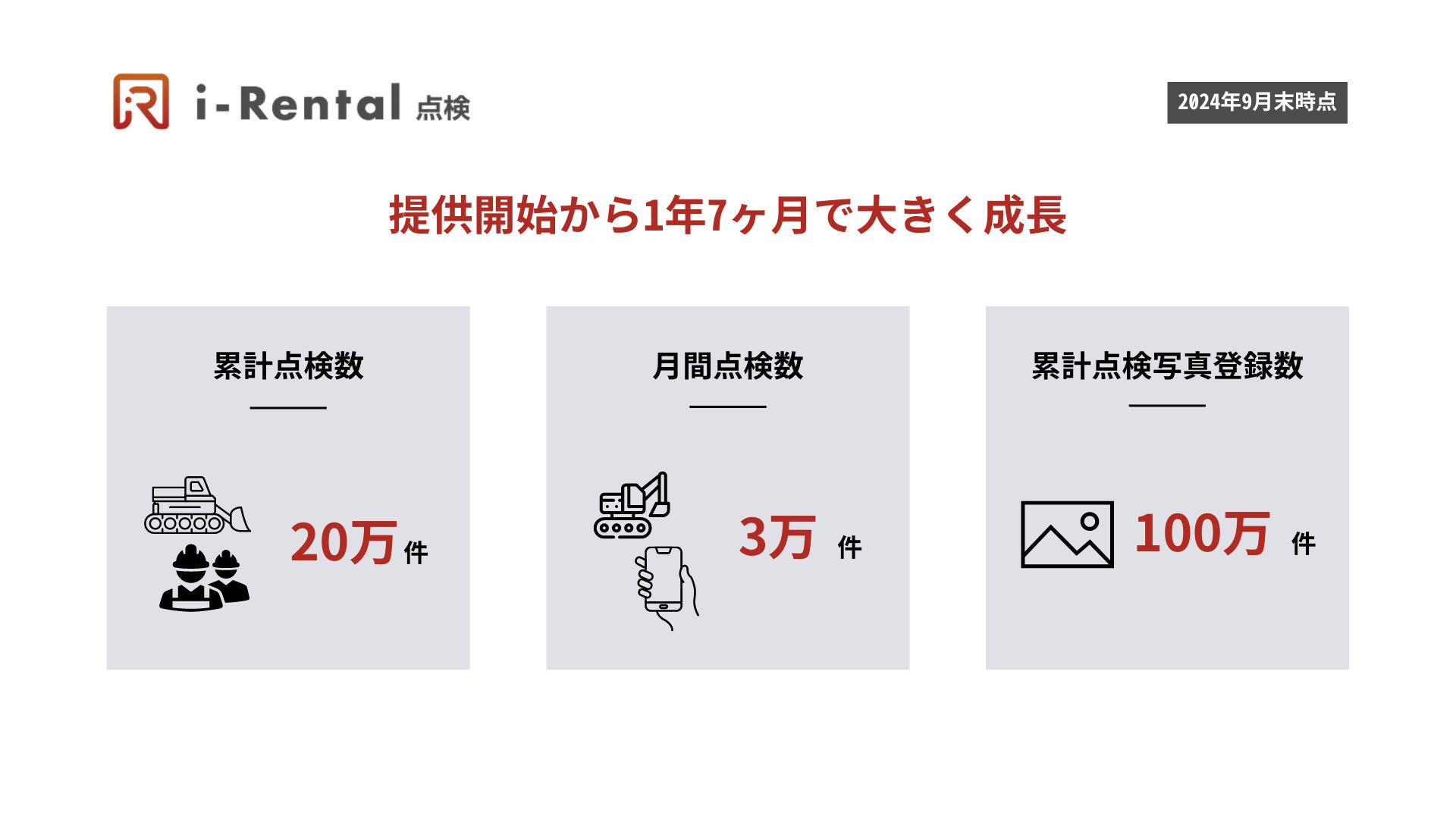 出典:PR TIMES,建機の点検表・修理伝票をペーパーレス化する「i-Rental 点検」累計点検写真登録数が1,000,000件を突破,https://prtimes.jp/main/html/rd/p/000000073.000015533.html,参照日2024-10-01