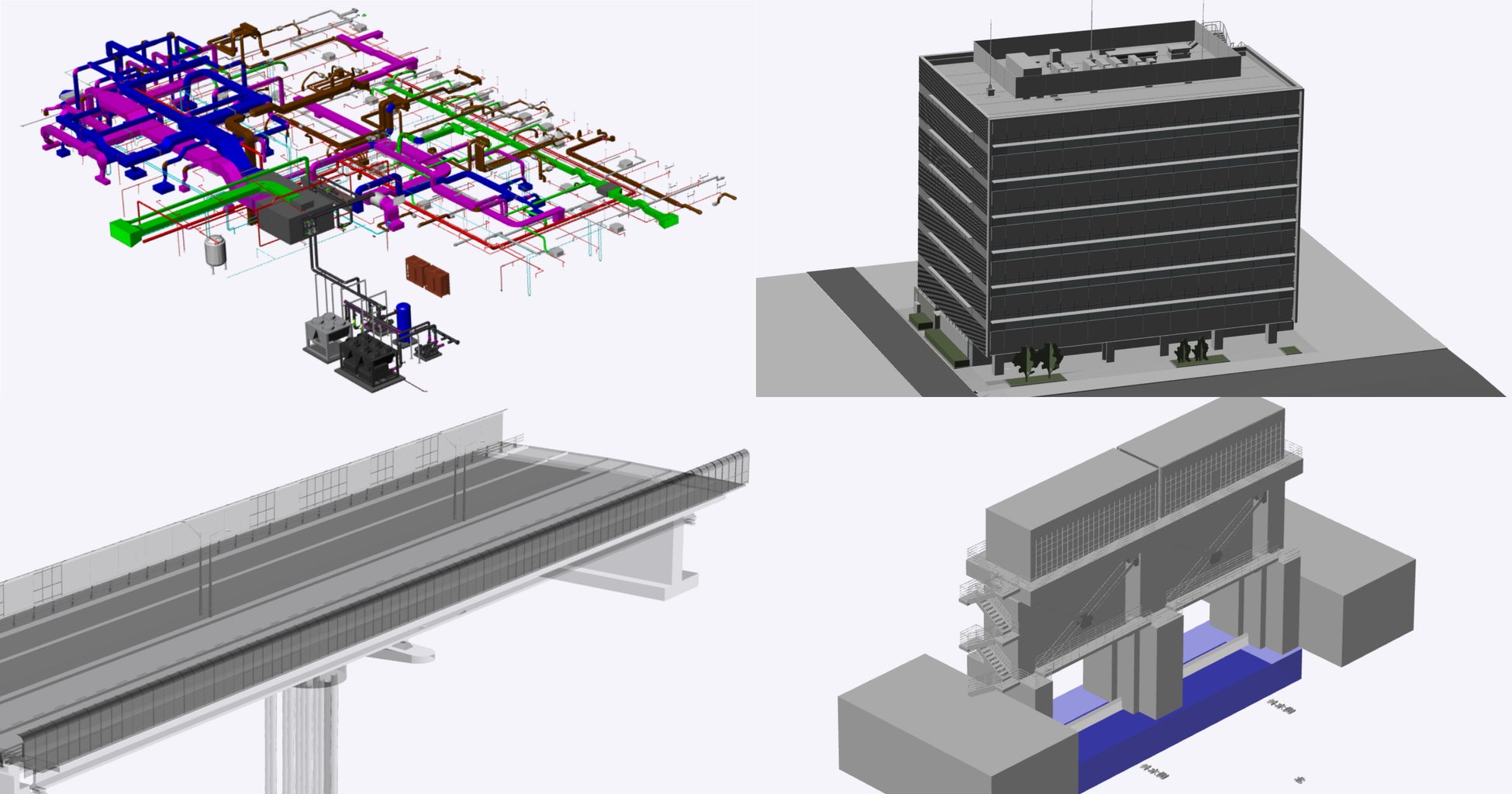 モデル化可能分野:プラント、工場、ビル、建築物、ダム、河川、樋門、橋梁、上下水施設、設備等