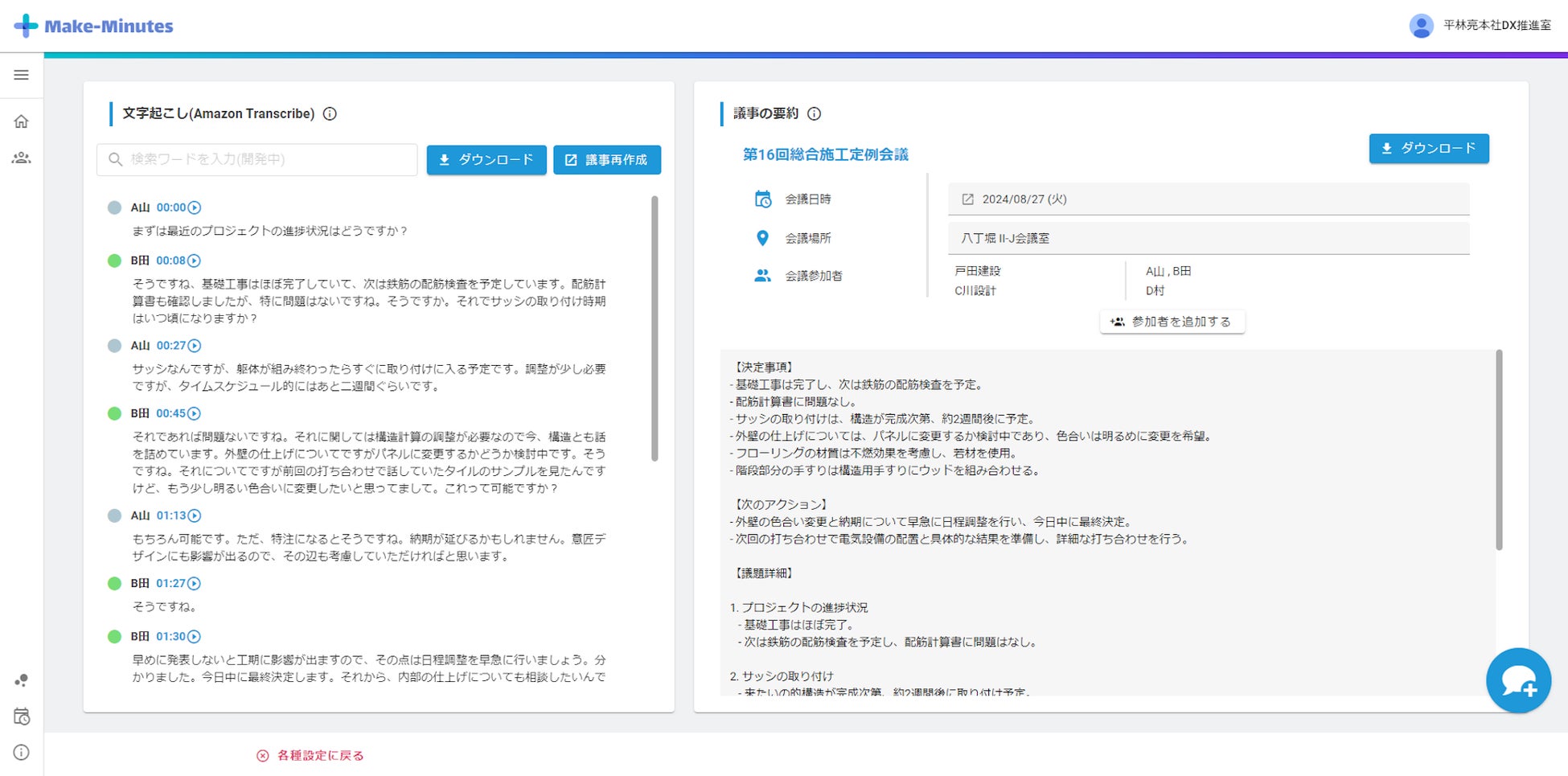 戸田建設株式会社(本社:東京都、代表取締役社長:大谷 清介)は株式会社Serverless Operations(本社:東京都、代表取締役社長:堀家 隆宏)の技術支援の元、生成AIを活用した自動議事録作成ツール「Make-Minutes」を開発しました。
