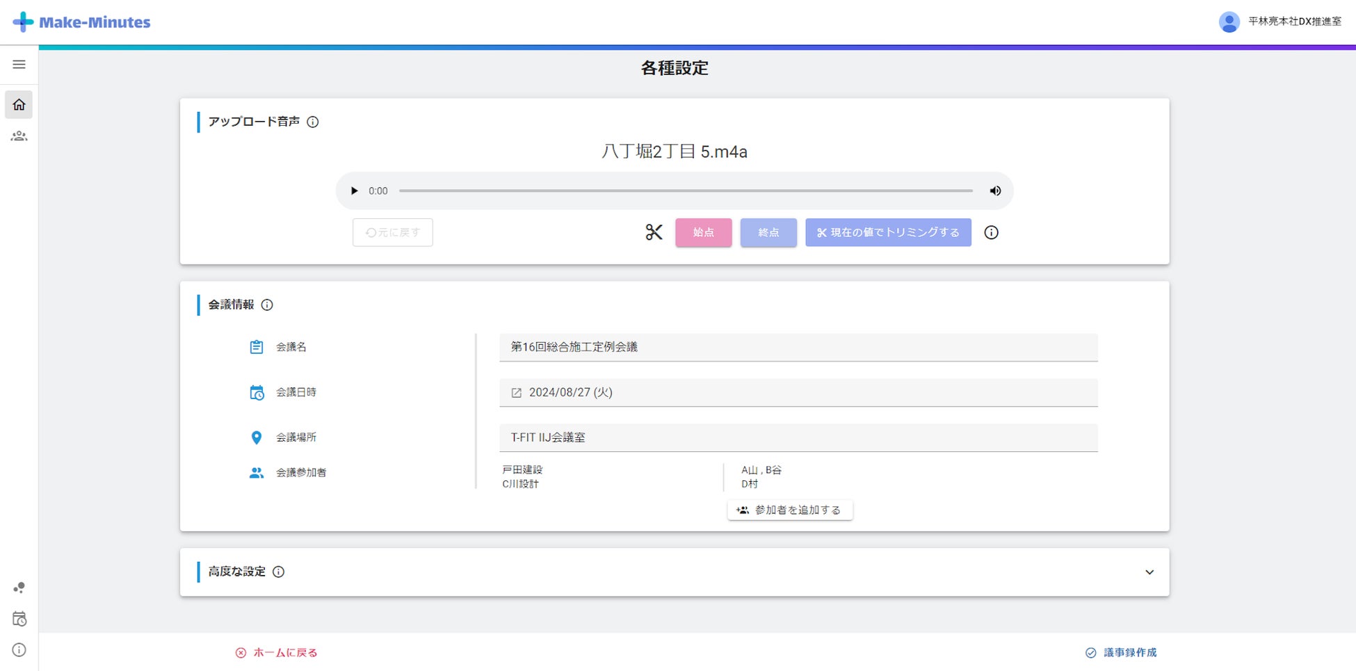 人間が行わなければならない作業は、音声ファイルのアップロードと、会議の名称、日時、場所、参加者を入力することだけ。最短なら、2クリックで議事録を作成できます。音声認識による文字起こしデータも、閲覧したり編集したりできます。不要な部分をトリミングしたり、反対に特定の部分だけを切り出すといった使い方も可能です。