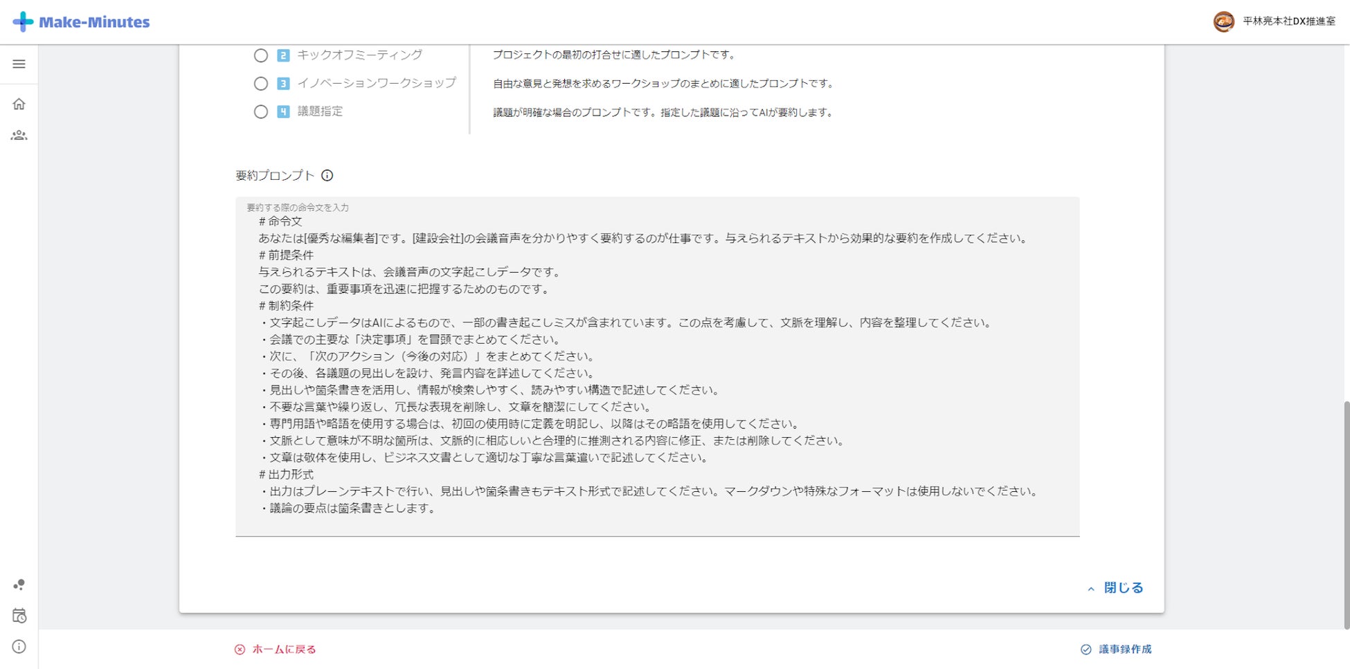 デフォルトでは汎用的なテンプレートになっており、それでほとんどの会議はカバーできますが、例えば議題が明確な場合の会議であったり、自由な発想や意見を出すことが目的のワークショップだったり、プロジェクト開始時のキックオフミーティングであったりなどは、専用のテンプレートを用意しています。また、ユーザーが必要に応じて自分でプロンプトを組むことができるようにもなっています。