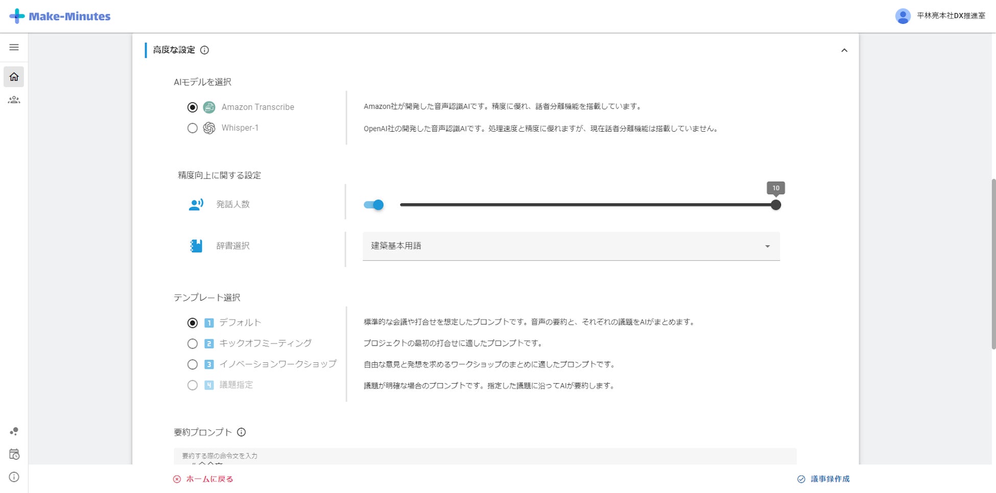 そうやって文字起こしをしたものをOpen AIが開発したLLMのGPT-4によって要約して、議事録として成形しています。要約の際には、会議の内容や性質に合わせたプロンプトを、テンプレートとしていくつか用意しており、それを利用者が選択します。