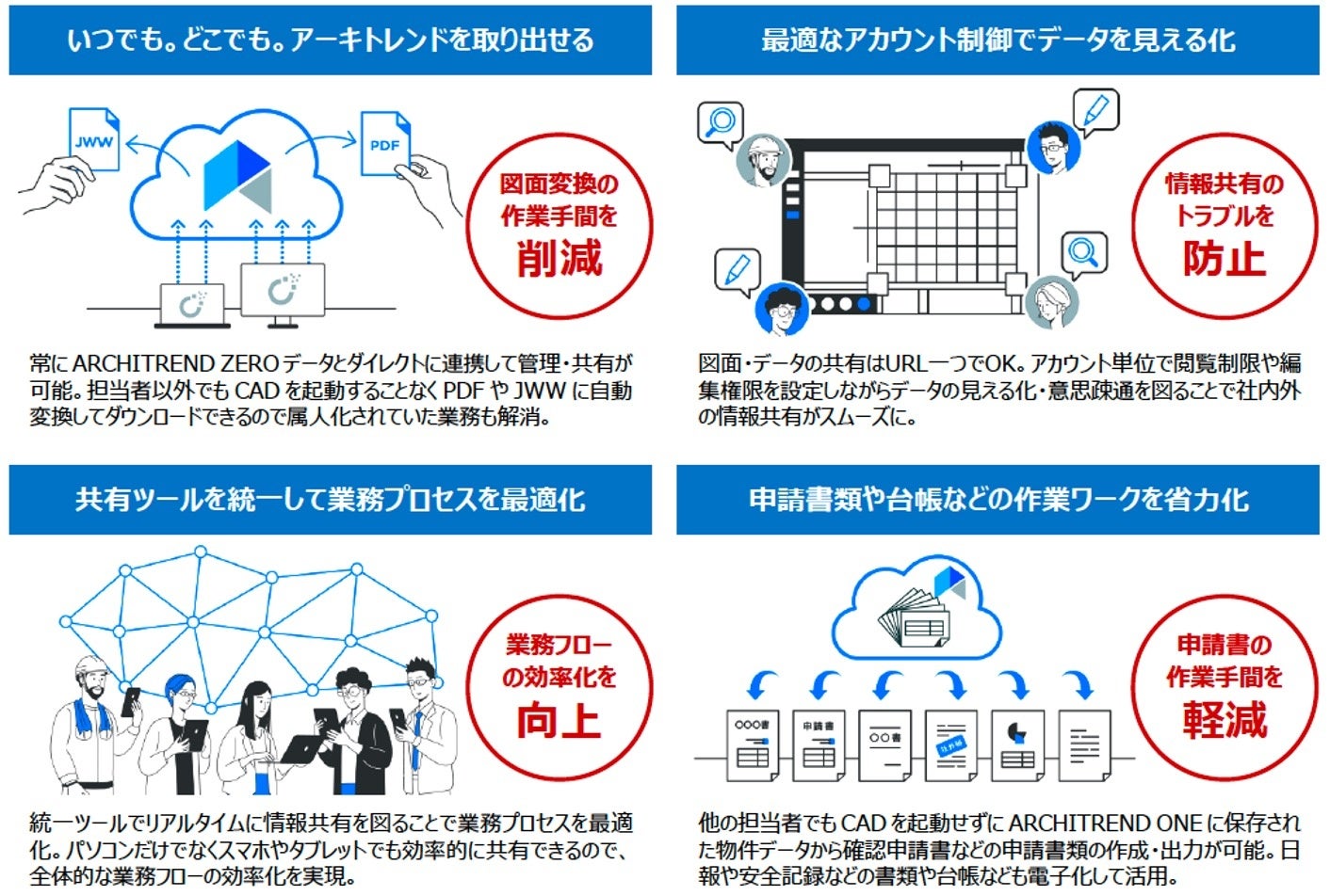 「ARCHITREND ONE」では、今後も各種プログラムとの連携や様々な業務を想定した機能拡張を図りながら設計コネクトサービスとしての有用性をさらに高めていくことで、将来的な業界情勢を見据えたユーザー様の業務支援並びに使用満足度の向上に努めてまいります。