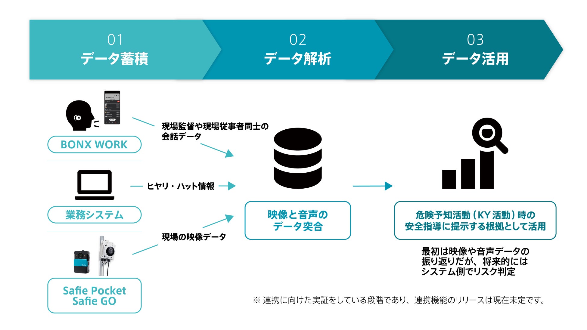 例えば、建設現場の危険エリア内を映した「Safie」カメラの映像データと、BONXから取得した現場監督や現場従事者同士の会話データ、ヒヤリ‧ハット情報などを紐づけることで、危険予知活動(KY活動)時の安全指導に提示する根拠として活用したり、振り返り時の原因分析に活用したりすることが可能になります。これにより、事故の防止対策や管理の効率化を実現します。