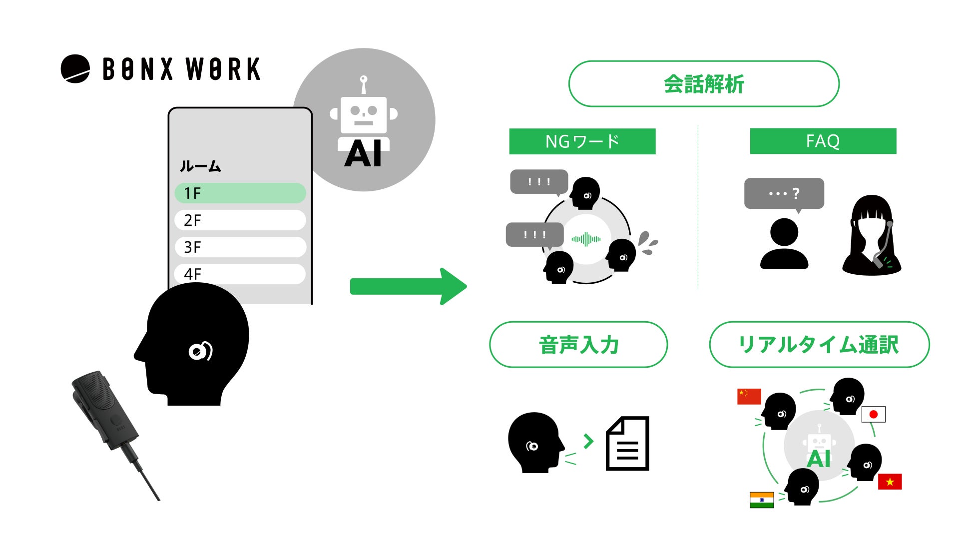 AI技術の進化によって実現可能なことの幅は飛躍的に広がりました。現場DXを推し進めていくには、AIの活用が必要不可欠です。BONXとNTTソノリティは、デスクレスワーカーの耳元に常にいる「音声インターフェイス」としての立ち位置を活かし、会話解析や音声入力による記録作成、リアルタイム通訳などのソリューションを順次展開してまいります。