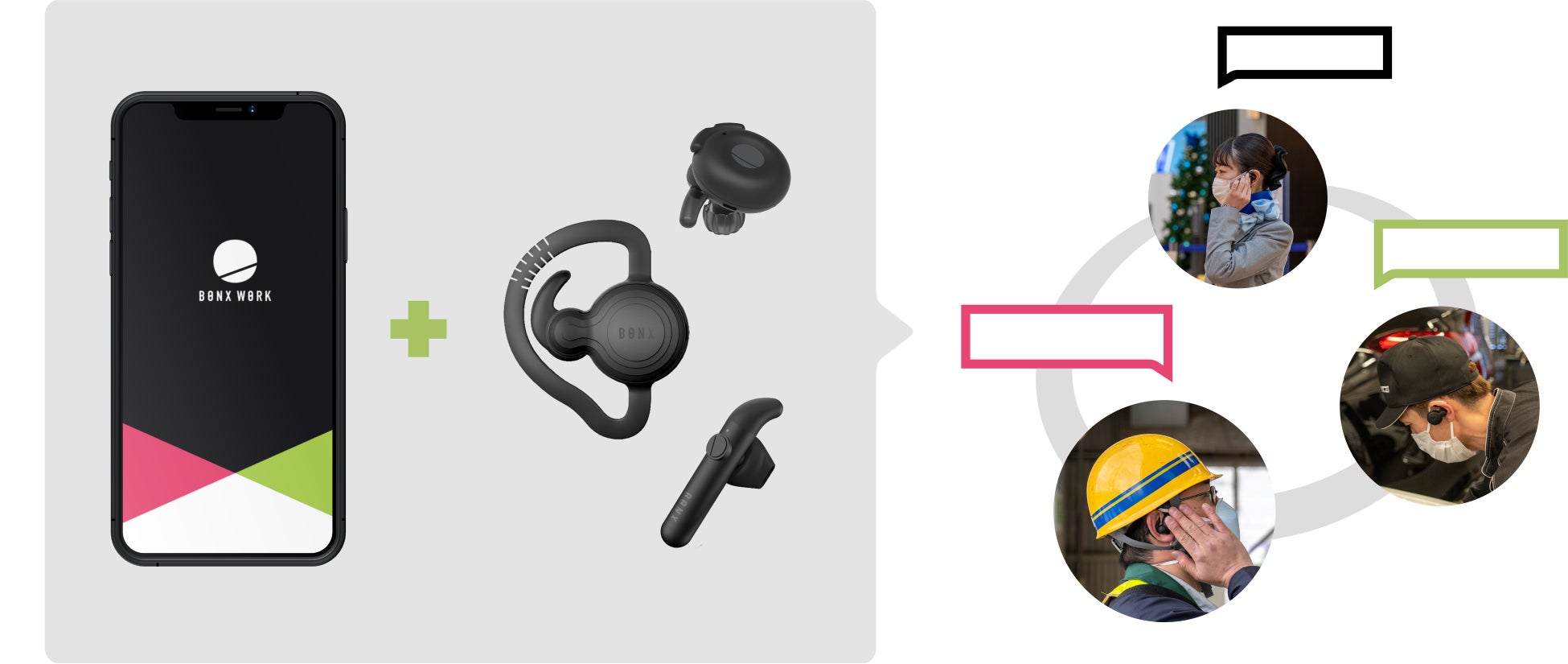 グループトークソリューション「BONX WORK」と専用イヤフォンである「BONX Grip」「BONX mini」「BONX BOOST (2022年発売予定)」を通じて、現場で働く方々である「デスクレスワーカー」に最適なチームコミュニケーションを提供しております。