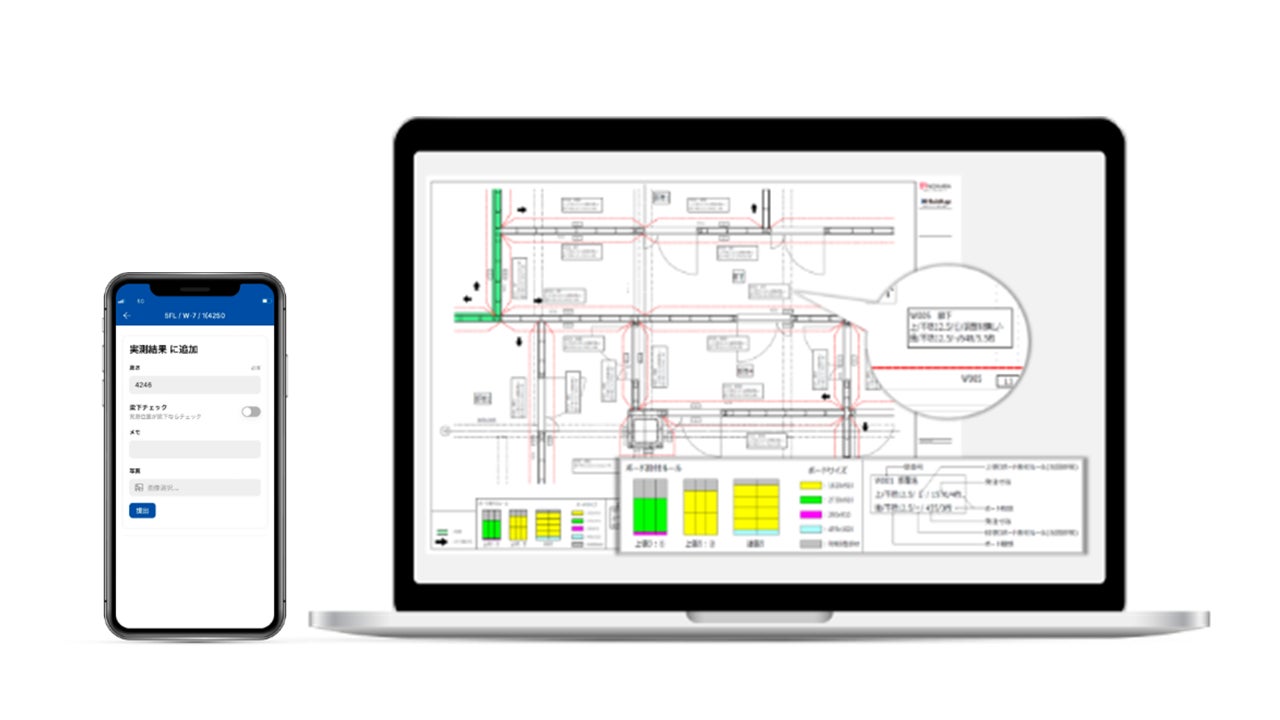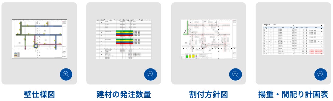 建材数量の拾いや資料作成の手間を大幅に削減することが可能。アウトプットは全て2D図面をはじめとした、PDFやExcelデータで出力できます。 - 実測支援ツールとプレカット建材納材でさらなる業務効率化を促進