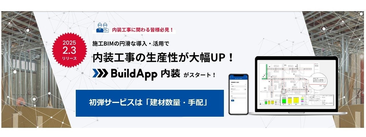 BuildApp(ビルドアップ)で建設DXに取り組む野原グループ株式会社(所在:東京都新宿区、代表取締役社長:野原弘輔)は、BIM設計-製造-施工支援プラットフォーム「BuildApp」より、施工プロセスにおける内装工事向けサービスである「BuildApp内装」の新サービスとして「BuildApp内装 建材数量・手配サービス」を2025年2月3日(月)に商用提供を開始いたします。