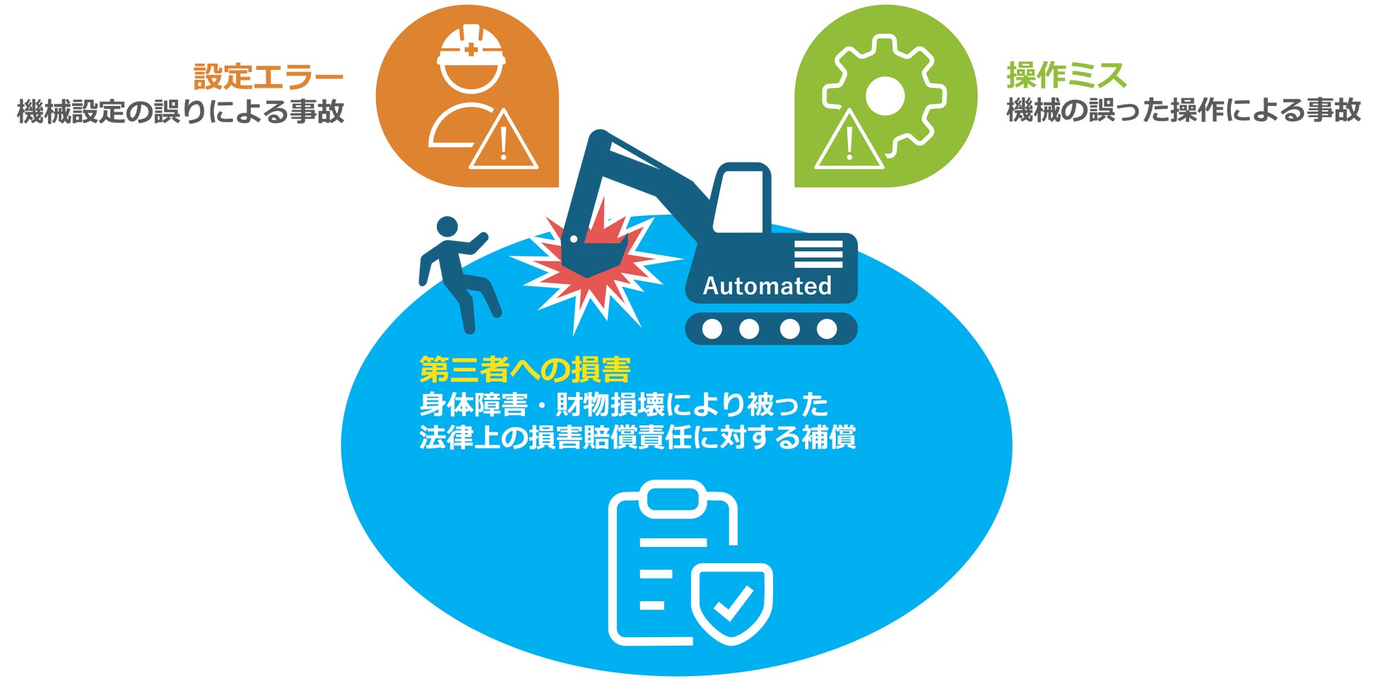 「事故補償パック for RX」は、ARAV 建機自動化システムを後付けした建設機械の自動作業時に、操作ミスや設定の誤りなどが原因で第三者に身体障害・財物損壊を与えた場合に生じる法律上の損害賠償責任を補償する制度です(※但し、著しく不当と判断される請求については、保険金をお支払いできない場合があります)。