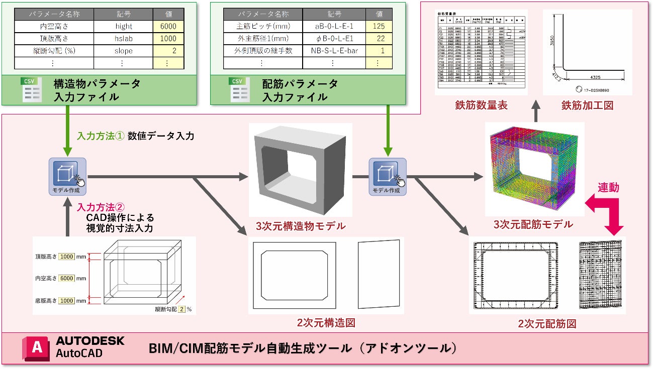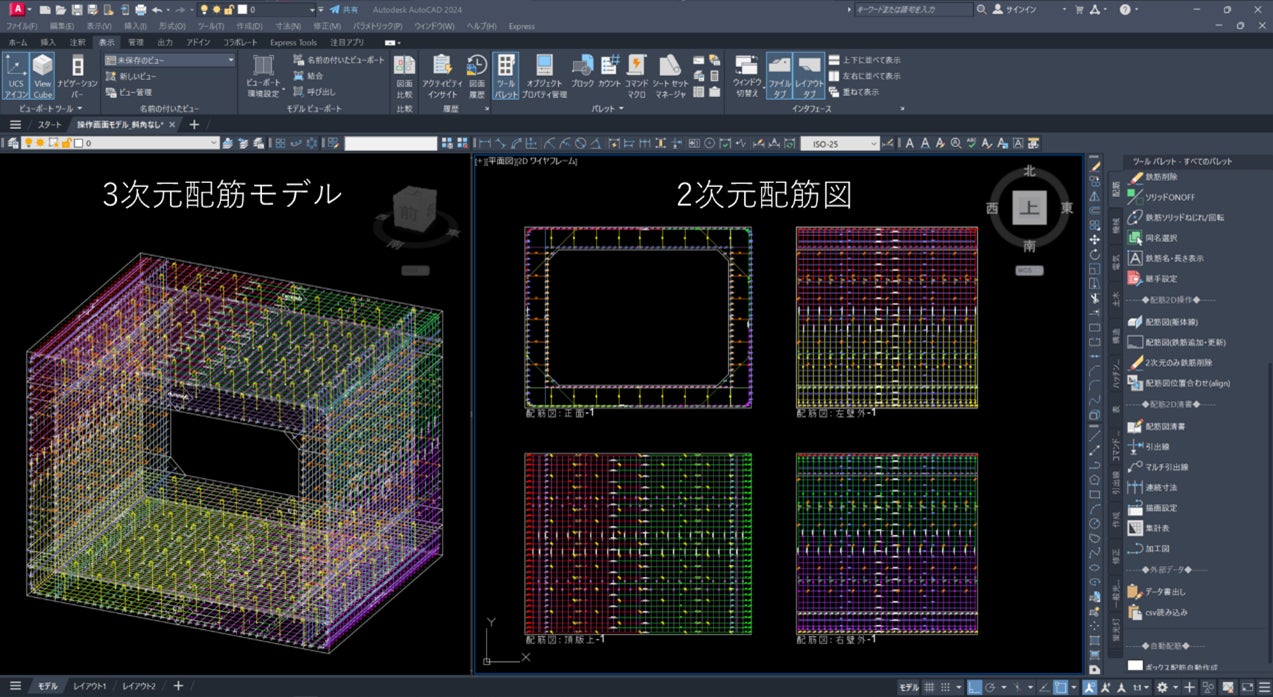土木事業ではBIM/CIMモデルの活用が進んでいますが、現状では発注者へ納品する2次元図面を作成した後に、BIM/CIMモデルを作成し、さらに2次元図面との整合を照査する必要があります。複雑な配筋モデルの構築には多大な時間を要することに加え、2次元図面とBIM/CIMモデル間の齟齬(そご)による手戻り作業が生じ、生産性を低下させる一要因となっていました。