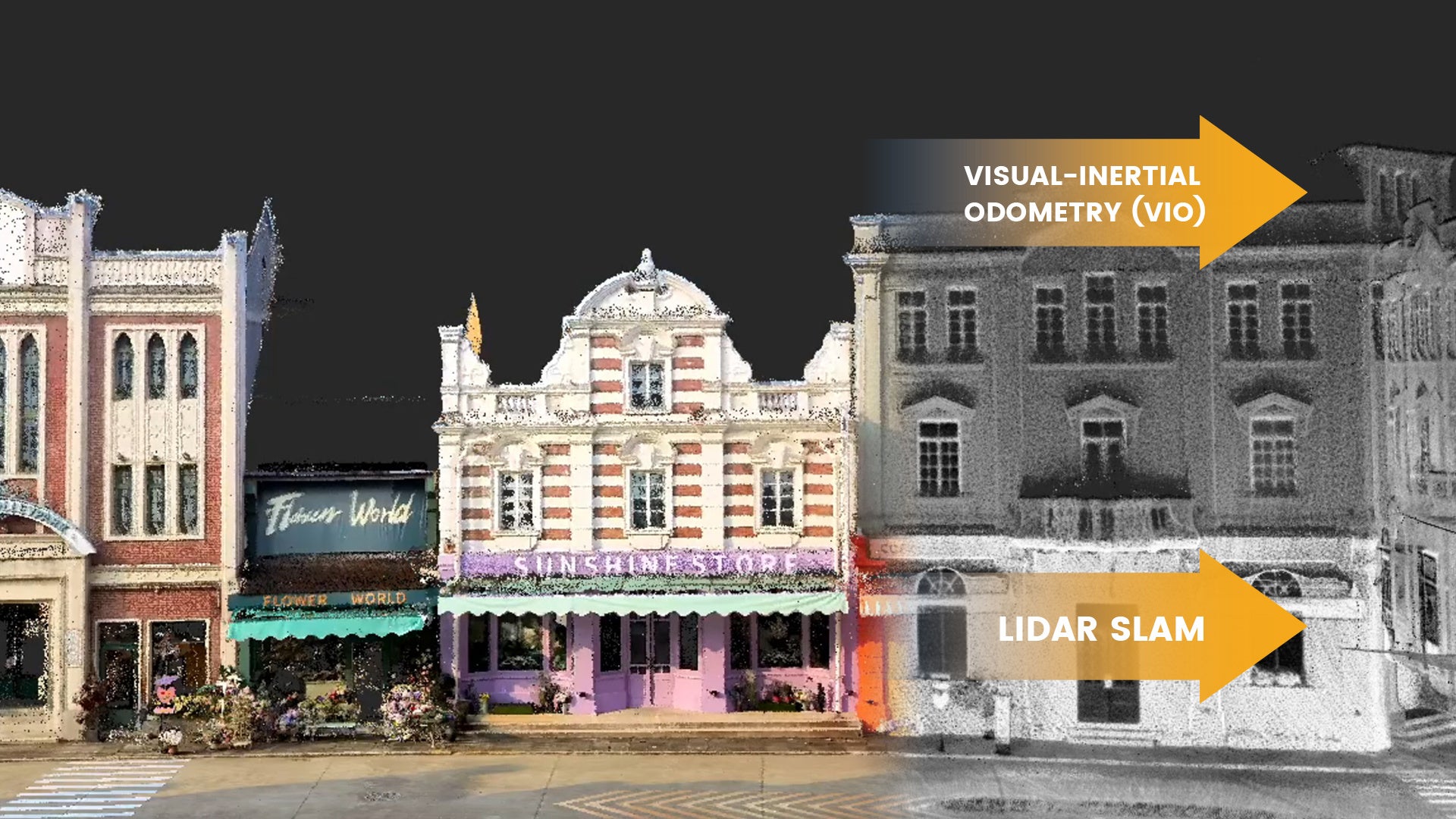 2台の12MPカメラを内蔵し、高度なVIO (Visual-Inertial Odometry)とSLAMアルゴリズムで高解像度画像を生成することで、トンネル等特徴点の少ない環境でも正確なデータを得ることができます。またリアルタイムの点群生成とカメラの視覚化が可能になり、オペレーターは現場でデータの品質を確認できます。
