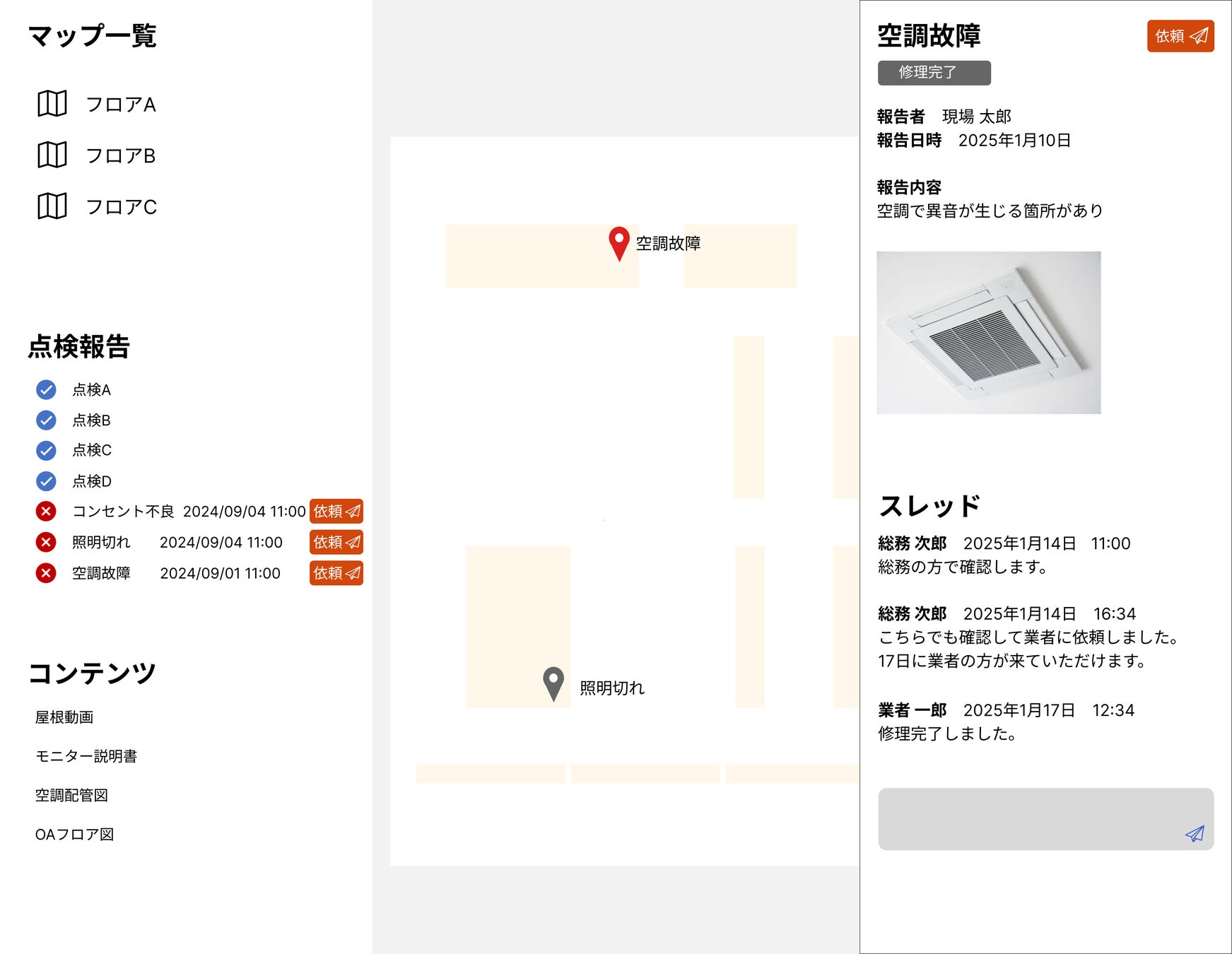 また、現場で空間情報付きで記録された情報は管理画面のマップ上でも確認可能です(図2)。報告の上がった場所を簡単に確認でき、対応検討のコミュニケーションをスムーズに行えます。