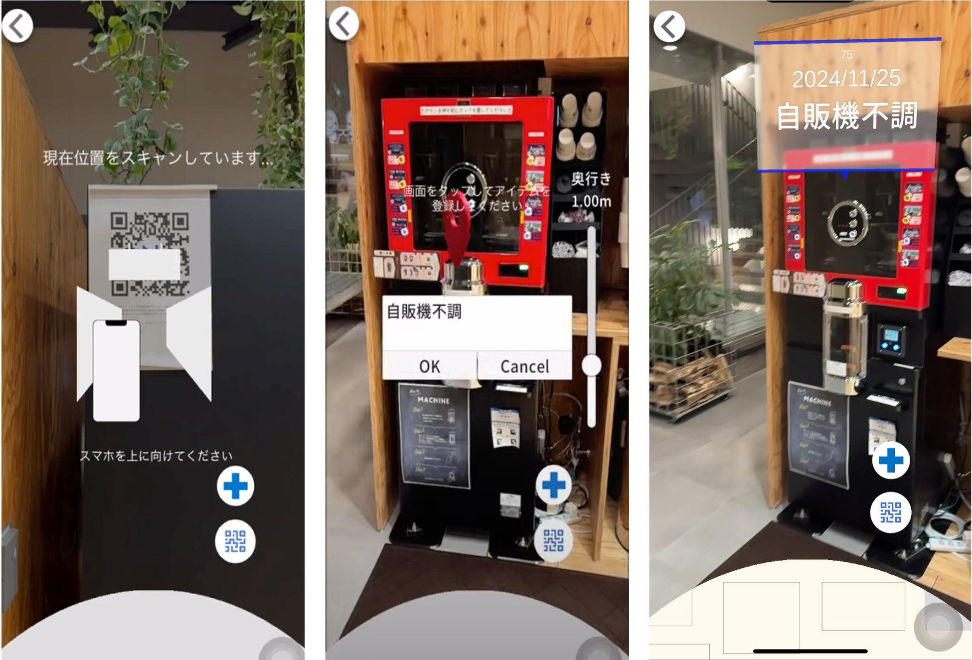 当社の空間情報管理システムIndooARを用いることで、QRコードを活用した3次元空間情報の特定、位置情報付きでの点検の報告、ARを活用した点検情報の可視化を実現します。