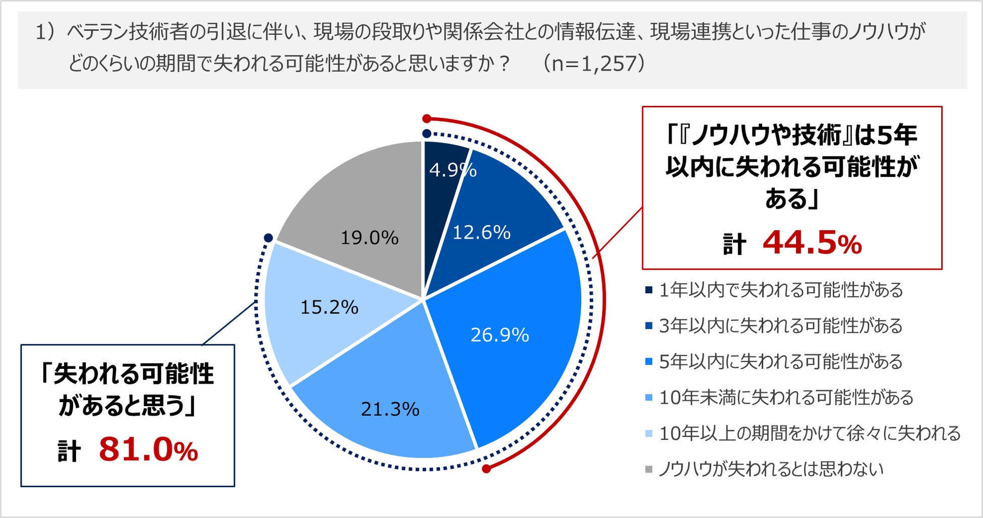 ●81.0%もの建設産業従事者が、ベテラン技術者のノウハウや技術が「失われる可能性がある」と懸念。そのうち、半数近く(44.5%)が「5年以内に失われる」と予測する結果となりました。