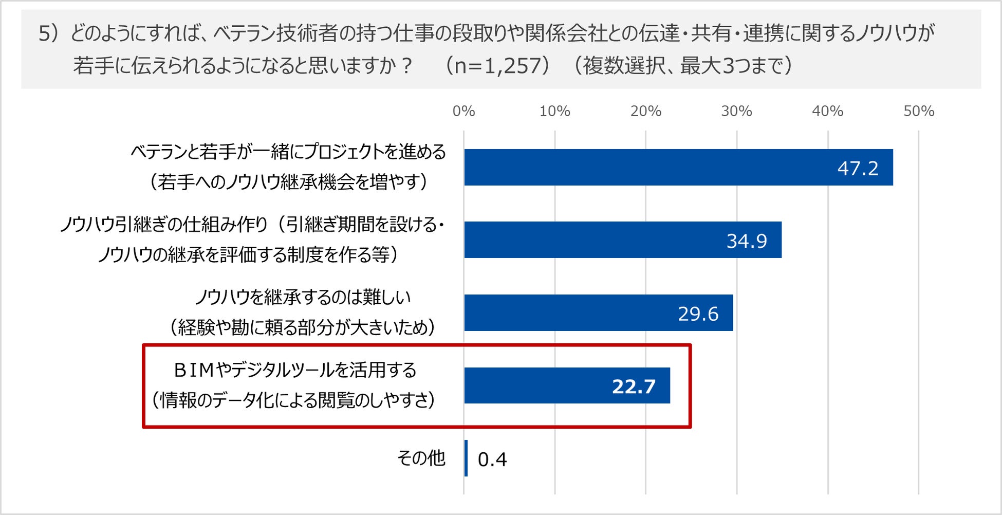 ●ノウハウや技術を若手に伝えるためには、「ベテランと若手が一緒にプロジェクトを進める」(47.2%)、「ノウハウ引継ぎの仕組み作り(引継ぎ期間を設ける・ノウハウの継承を評価する制度を作る等)」(34.9%)が上位に。経験や勘に頼る部分が大きいため「ノウハウを継承するのは難しい」(29.6%)との回答も3割に上った。一方、約5人に1人は、「BIMやデジタルツールを活用する」(22.7%)ことでノウハウや技術のデジタル化と若手への継承が進むことを期待している。