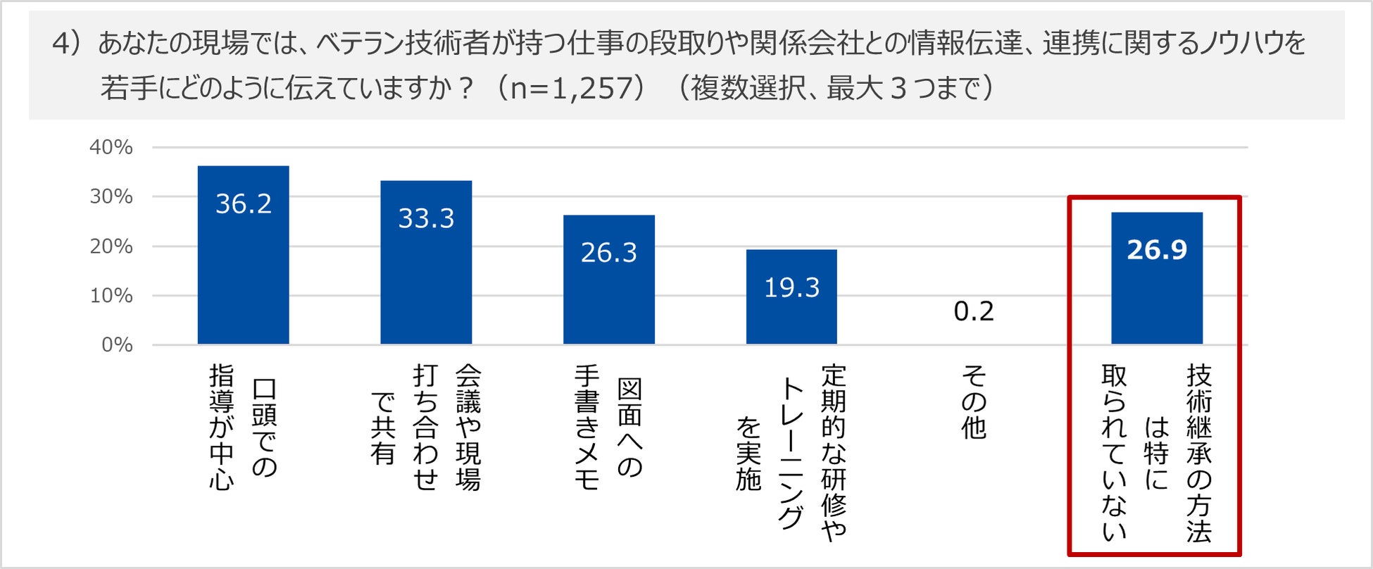 2. ノウハウや技術の継承はアナログ頼み。「継承の方法が取られていない」という回答も4人に1人に