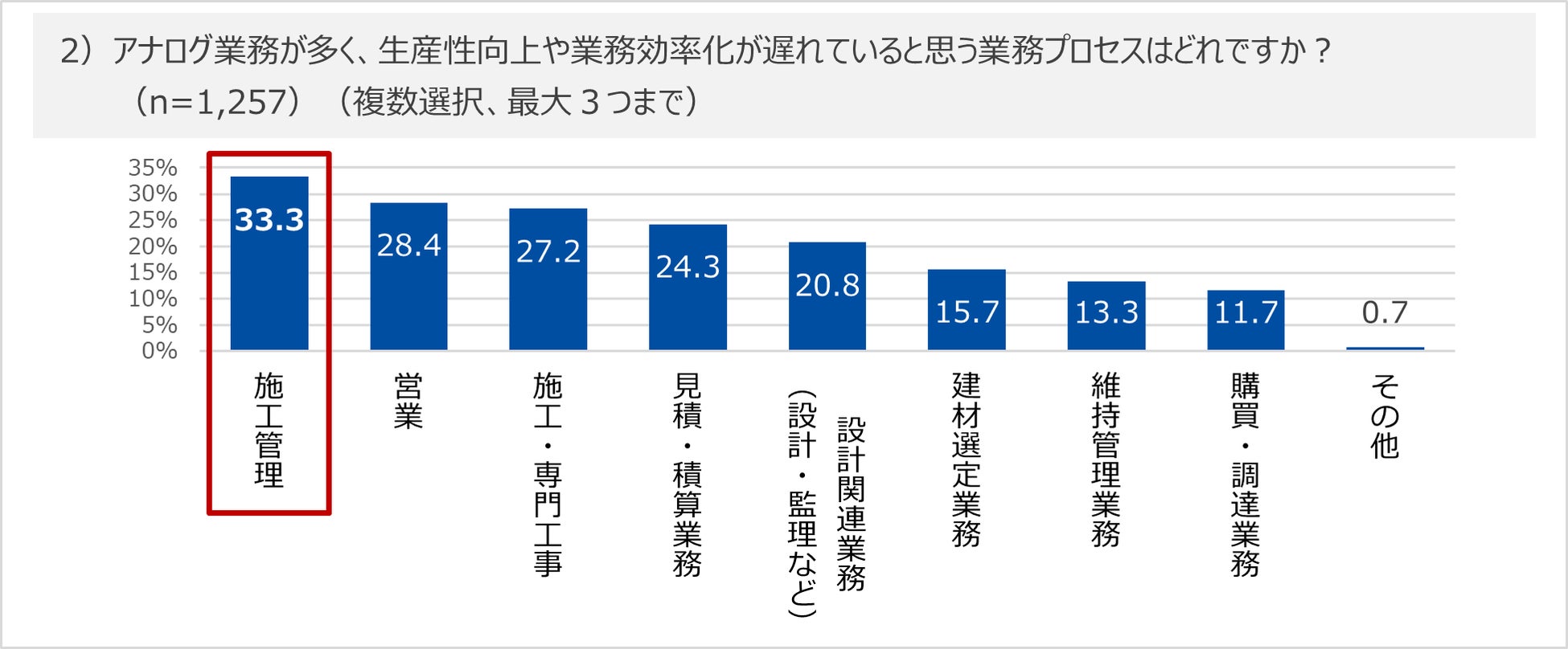特に生産性向上や業務効率化の遅れが目立つ業務プロセスは、3人に1人が「施工管理」と回答