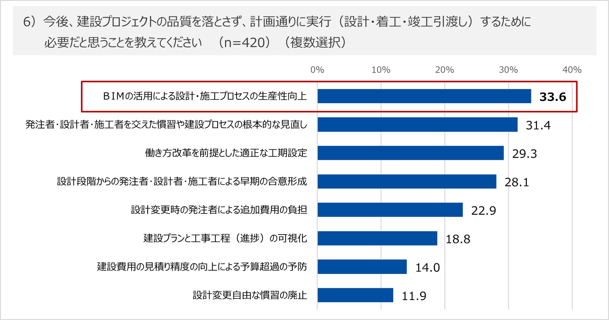 ●建築主に聞いた建設プロジェクトの品質を落とさず実行するために必要なことでも「BIMの活用による設計・施工プロセスの生産性向上」(33.6%)が最も多い回答を集めました。