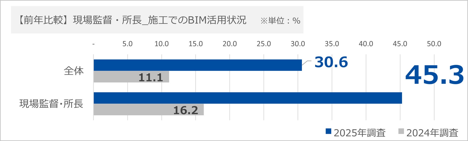 現場監督・所長、「施工でBIM活用」との回答が前年の16.2%から45.3%へ上昇