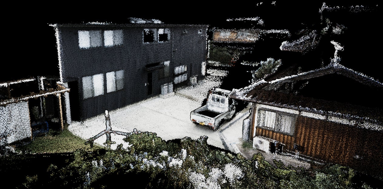 500万画素×2台のカメラにより、点群に色情報を付加。さらに、動画と点群を連動して確認できるため、現場状況の記録や報告に活用しやすく、発注者との合意形成や現地の記録保存にも有効です。 - RTK-SLAMおよびGCPによる補正に対応