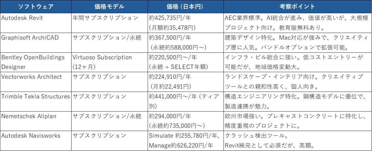 2025年のBIMソフトウェア市場における価格構造は、民主化実現に対する最大の障壁として機能している。サブスクリプションモデルが主流となり、月額約2万円〜7万円、永続ライセンス約29万円〜88万円という高価格帯で推移している現状は、技術の恩恵を受けられる層を大幅に制限している。