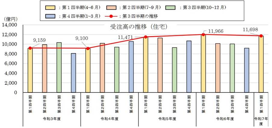 住宅関連工事については1兆1,698億円の受注となり、前年同期比で2.2%の減少となりました。減少幅は比較的小幅にとどまっており、市場の安定性が確認されています。